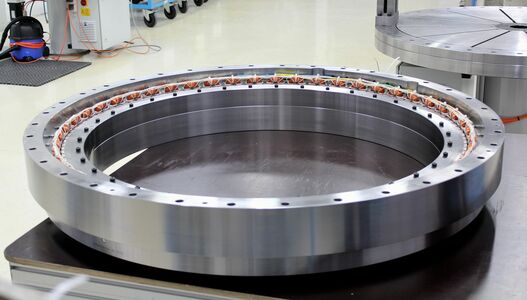 I gruppi di cuscinetti Franke con azionamento diretto integrato (motore dinamometrico) sono caratterizzati da un'elevata dinamica, la massima efficienza energetica e uno spazio di installazione compatto combinato con un design privo di centro.