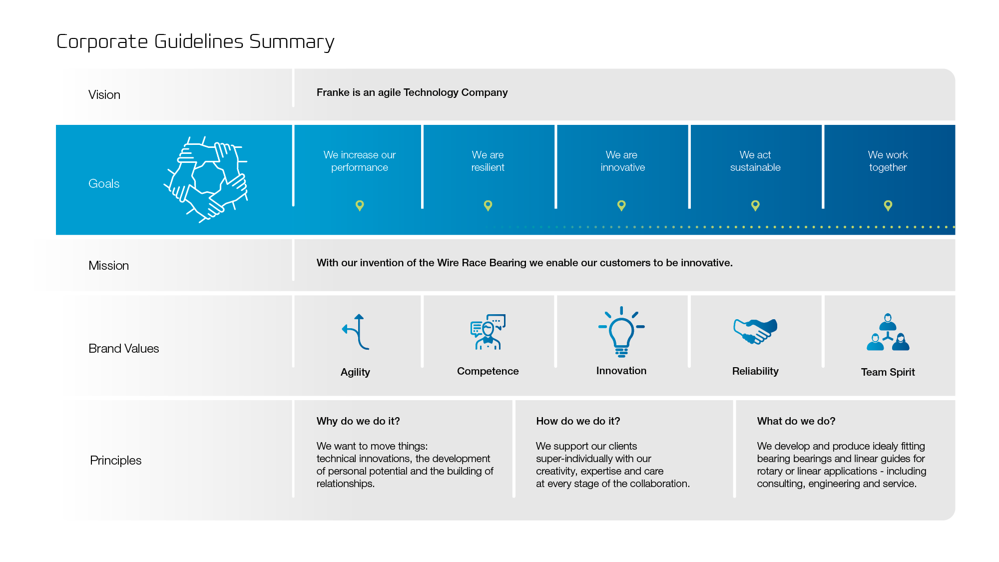 Il nostro grafico visualizza la dichiarazione di missione di Franke come un modello generale ben congegnato che costituisce la base delle nostre attività imprenditoriali. Inizia con le solide fondamenta che rappresentano i nostri valori e le nostre convinzioni di base.